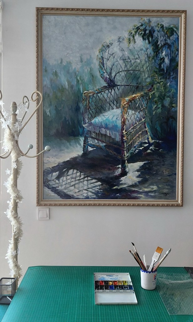 SILLÓN DE MIMBRE Medidas: 140 x 120 cm Técnica: Óleo sobre lienzo. GRAN FORMATO.